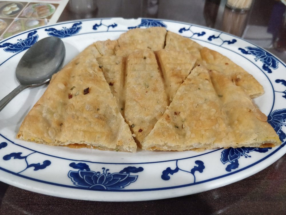 Scallion pancake , and I felt I had one of the best scallion pancakes I ever had . They were absolutely non greasy – rightly crisp , just the way you know it has scallions inside but does not seem overcooked or undercooked.